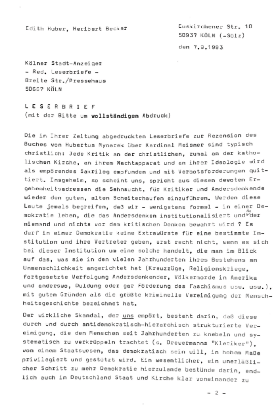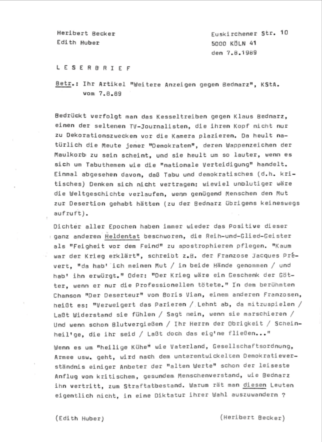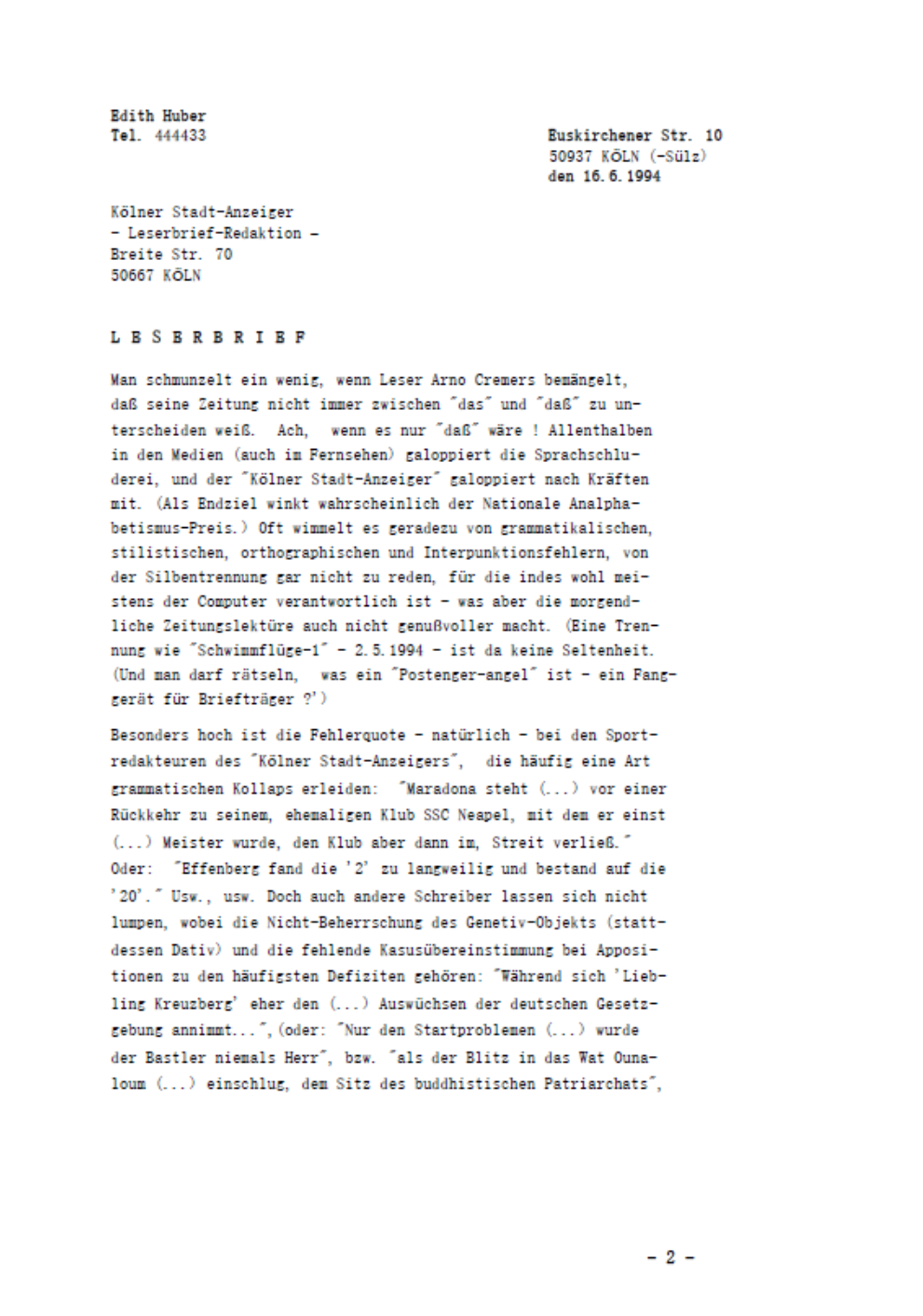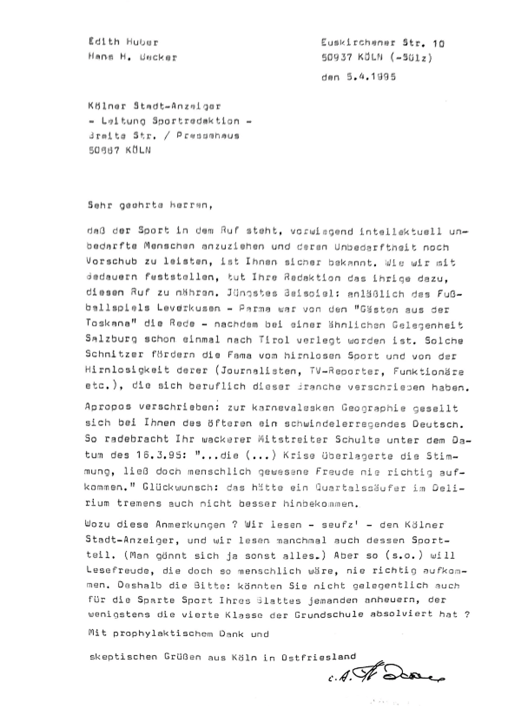 Er publizierte gelegentlich auch in der lokalen Presse: kurze Artikel, häufig auf der Leserbriefseite des Kölner Stadt-Anzeigers. Diese verfasste er nie polemisch, häufig provokant, gemeinsam mit seiner Lebensgefährtin. Er blieb bis zuletzt täglicher, letztendlich treuer Leser der Printausgabe des Blattes.