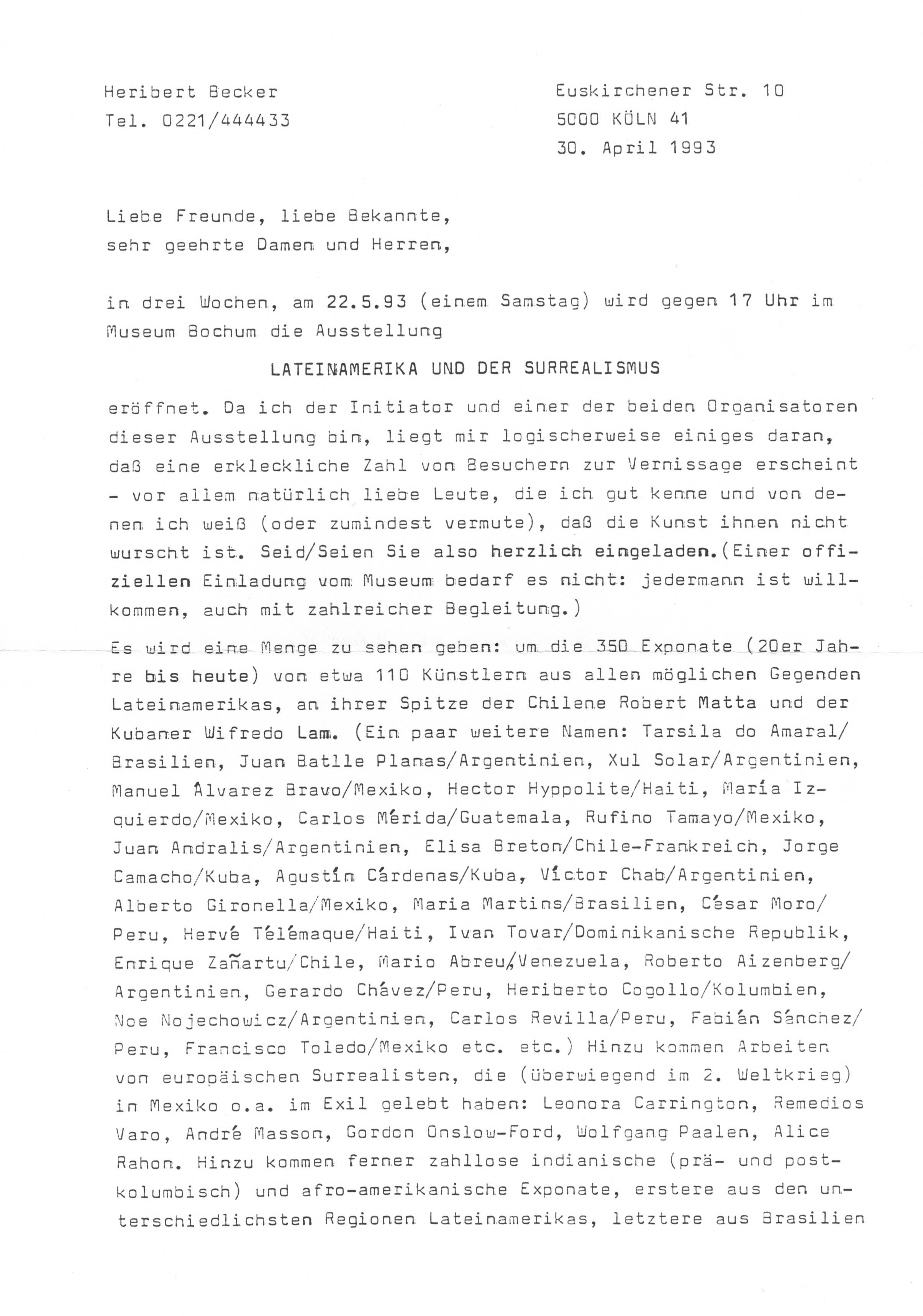 Im Sommer 1993 fand die zweite Ausstellung im Museum Bochum (heute: Kunstmuseum Bochum) mit Beckers kuratierender Beteiligung statt. Aus diesem Anlass verschickte er eigeninitiativ den etwa 400 Seiten umfassenden Katalog (es gibt keine Seitenzahlen!) an zahlreiche Freunde und Verlage. Ergänzt wurde diese Sendung durch einen begleitenden Brief mit Wegbeschreibung sowie Flyer und A4-Broschüre.