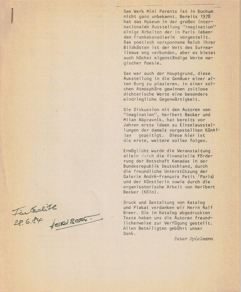 Die erste Einzelausstellung der Künstlerin Mimi Parent in Deutschland, konzipiert durch Heribert Becker, fand im Sommer 1984 im Haus Kemnade, der Außenstelle des Museums Bochum, statt. Zur Vernissage am 23. Juni reiste sie und ihr Lebensgefährte Jean Benoît aus Paris an und wohnten im Kölner Studio Milan Nápravníks, wo anschließend mehrere Fotos durch den Tschechen entstanden. Auch bei einer anschließenden Sightseeing-Tour durch Köln wurde fotografiert.